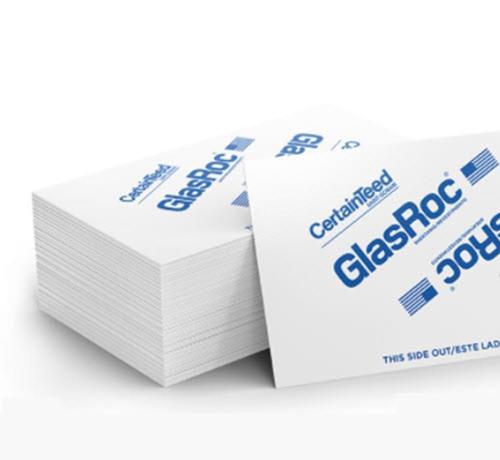CertainTeed's GlasRoc Sheathing is a high-performance, non-combustible gypsum-based sheathing that offers exceptional fire resistance, moisture resistance, and mold resistance for exterior wall and soffit systems. Made from a combination of gypsum core and fiberglass mat facers, the product is engineered to withstand the elements and provide long-lasting performance.