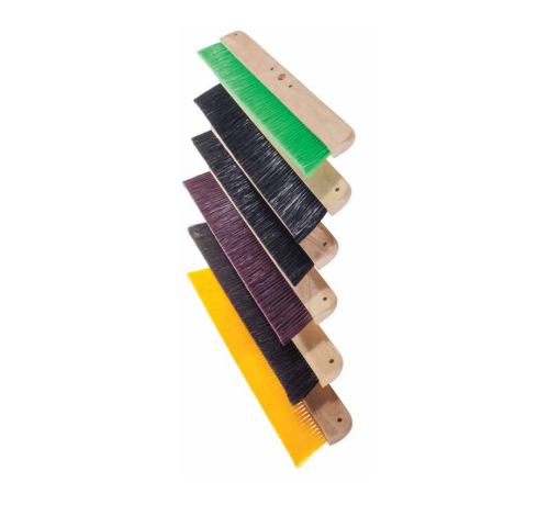 Staple set in clear lacquered hardwood block with one threaded (TH) handle hole. Three rows of filling material. These brushes are used for applying finishes on newly poured concrete. Block accepts threaded handle (sold separately) and includes a hang up hole and two brace holes (brace sold separately).